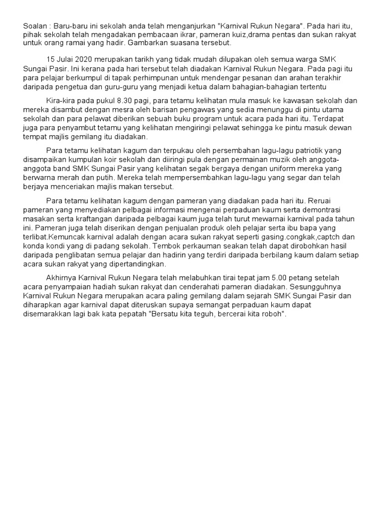 Karangankeperihalan Karnival Rukun Negara KARANGAN TIDAK BERFORMAT KEPERIHALAN. Soalan berkaitan penulisan karangan Bahasa Melayu lazimnya adalah berkaitan dengan isu semasa. Manfaat yang diperoleh dari Prinsip Rukun Negara.